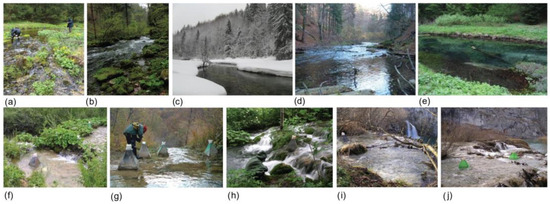 Photo examples of study sites included in the study: springs: (a) Bijela rijeka spring, (b) Crna rijeka spring; streams (and small mountainous rivers): (c) Bijela rijeka middle reaches, (d) Crna rijeka middle reaches, (e) Crna rijeka lower reaches, (f) Plitvica, (g) Korana; tufa barriers: (h) Labudovac, (i) Kozjak–Milanovac, (j) Novakovića Brod.