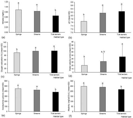 Environmental variables at three Dinaric karst lotic habitat types in the Plitvice Lakes NP, Croatia (shown as mean annual values with standard deviation, SD): (a) nitrate concentration, (b) pH, (c) oxygen saturation, (d) water velocity, (e) conductivity, and (f) alkalinity. Significant differences among the habitat types are indicated by different letters (Kruskal–Wallis H test with multiple comparisons post hoc test, p < 0.05).