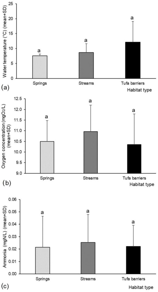 Environmental variables at three Dinaric karst lotic habitat types in the Plitvice Lakes NP, Croatia (shown as mean annual values with standard deviation, SD): (a) water temperature, (b) oxygen concentration, and (c) ammonia concentration. Non-significant differences among the habitat types are indicated by the letter a (Kruskal–Wallis H test with multiple comparisons post hoc test, p > 0.05).