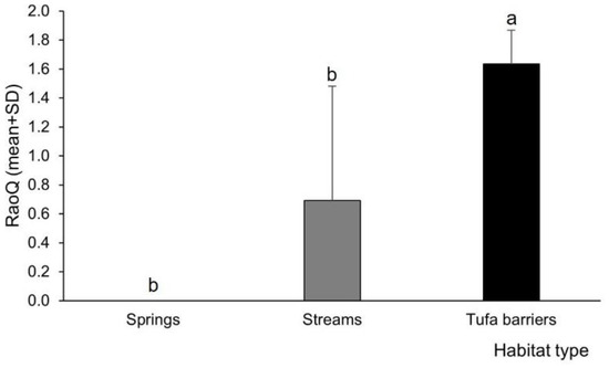 Dragonfly functional diversity (RaoQ index) at three Dinaric karst lotic habitat types in the Plitvice Lakes NP, Croatia (shown as mean with standard deviation, SD). Significant differences among the habitat types are indicated by different letters (Kruskal–Wallis H test with multiple comparisons post hoc test, p < 0.05).