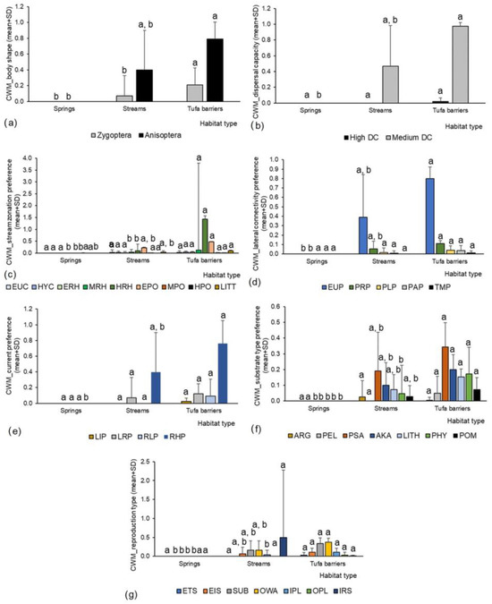 Dragonfly functional traits at three Dinaric karst lotic habitat types in the Plitvice Lakes NP, Croatia (shown as mean with standard deviation, SD): (a) body shape, (b) dispersal capacity, (c) stream zonation preference, (d) lateral connectivity preference, (e) current preference, (f) substrate type preference, and (g) reproduction type. Significant differences among the habitat types are indicated by different letters (Kruskal–Wallis H test with multiple comparisons post hoc test, p < 0.05). Legend: DC = dispersal capacity; EUC = eucrenal, HYC = hypocrenal, ERH = epirhithral, MRH = metarhithral, HRH = hyporhithral, EPO = epipotamal, MPO = metapotamal, HPO = hypopotamal, LITT = littoral; EUP = eupotamon, PRP = parapotamon, PLP = plesiopotamon, PAP = palaeopotamon, TMP = temporary water bodies; LIP = limnophil, LRP = limno- to rheophil, RLP = rheo- to limnophil, RPH = rheophil; ARG = argyllal, PEL = pelal, PSA = psammal, AKA = akal, LITH = lithal, PHY = phytal, POM = particulate organic matter; ETS = eggs laid attached to substrate, EIS = eggs laid in substrate, SUB = eggs laid not attached to or in substrate, OWA = eggs laid in open water, IPL = eggs laid inside plant tissue, OPL = eggs laid onto plant material, IRS = eggs laid into submerged soil or onto submerged rock.