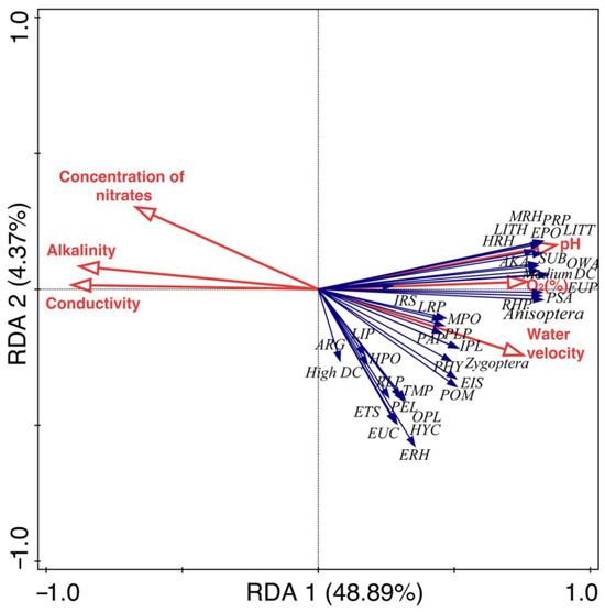 Redundancy analysis (RDA) ordination biplot showing the relationship between dragonfly functional traits and six significant environmental variables in Dinaric karst lotic habitats in the Plitvice Lakes NP, Croatia. Abbreviations of the functional (life history) traits are in Figure 4.