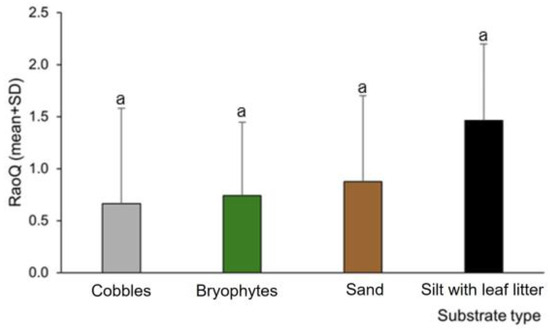 Dragonfly functional diversity (RaoQ index) at four main substrate types in three Dinaric karst lotic habitats in the Plitvice Lakes NP, Croatia (shown as mean with standard deviation, SD) Non-significant differences among the habitat types are indicated by the letter a (Kruskal–Wallis H test with multiple comparisons post hoc test, p > 0.05).