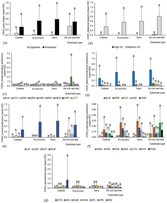 Dragonfly functional traits at four main substrate types in three Dinaric karst lotic habitats in the Plitvice Lakes NP, Croatia (shown as mean with standard deviation, SD): (a) body shape, (b) dispersal capacity, (c) stream zonation preference, (d) lateral connectivity preference, (e) current preference, (f) substrate type preference, and (g) reproduction type. Significant differences among the habitat types are indicated by different letters (Kruskal–Wallis H test with multiple comparisons post hoc test, p < 0.05). Abbreviations of the functional (life history) traits are in Figure 5.