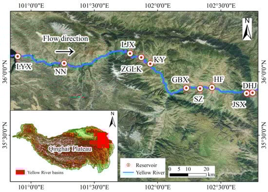 Distribution of cascade reservoirs in the upper reaches of the Yellow River. Longyangxia (LYX), Ninna (NN), Lijiaxia (LJX), Zigonglaka (ZGLK), Kangyang (KY), Gongboxia (GBX), Suzhi (SZ), Huangfeng (HF), Jishixia (JXS), and Dahejia (DHJ).