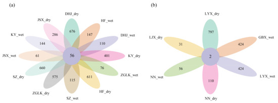 Venn diagram of OTUs of reservoirs in the young reservoirs (a) and old reservoirs (b). The first part of the abbreviation represents the reservoir name, while the second part represents the sampling seasons.