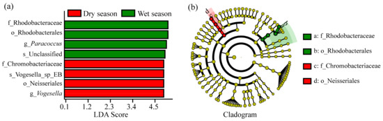 The results of the LEfSe analysis between different seasons are shown in Figure 4. When the LDA score exceeded 4, there were eight indicator nirS-type denitrifying bacterial groups that exhibit differences between two seasons. Vogesella, Neisseriales, Vogesella_sp__EB, and Chromobacteriaceae had essential roles in the nirS-type denitrifying bacterial groups of the dry season. In the wet season, four indicator taxonomies were observed as follows: Rhodobacteraceae, Rhodobacterales, Paracoccus, and unclassified nirS-type denitrifying bacteria.