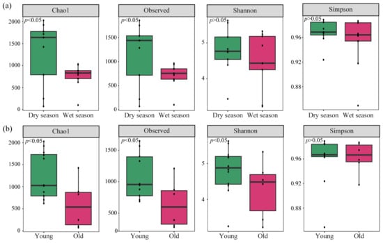 The alpha diversity of nirS-type denitrifying bacteria in sediments of cascade reservoirs is shown in Figure 5. In terms of time, the average values of Chao1 and Observed indices were higher in the dry season compared to the wet season (p < 0.05). Similarly, the variation trend of Simpson’s and Shannon’s indices was consistent with that of Chao1 and Observed indices (Figure 5a). Among reservoirs of different ages, Chao1, Observed, Shannon’s, and Simpson’s indices showed no significant differences. On the whole, the young reservoirs scored higher than the old ones (Figure 5b).