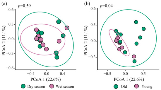PCoA analysis of sediment nirS-type denitrifying bacteria between different seasons (a) and reservoir ages (b).