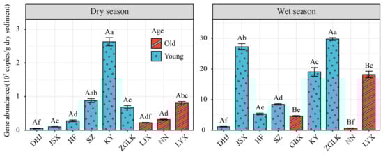 Abundance of nirS gene in different seasons and reservoir age. Uppercase and lowercase letters denote statistically significant differences (p < 0.05) in gene abundance between young and old reservoirs, and among 10 cascade reservoirs within the same season, respectively. Error bars represent standard deviations.