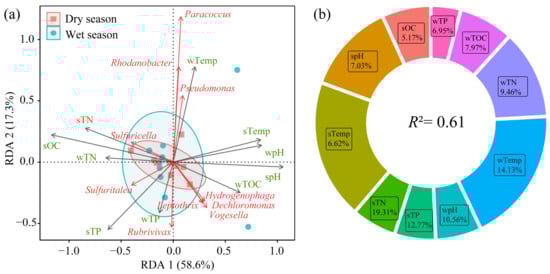 Redundancy analysis (a) and hierarchical partitioning (b) of environmental factors and nirS-type denitrifying bacteria communities. Red arrows indicate dominant bacterial genera, while gray arrows represent environmental factors. Blue and red circles denote the 95% confidence intervals for reservoir ordination in the wet and dry seasons, respectively.