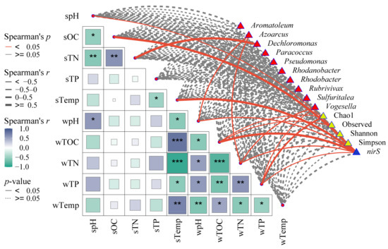 The relationship between the dominant genus, diversity, and abundance of nirS-type denitrifying bacteria and environmental factors is illustrated in Figure 9. It was found that sTN showed a significant positive correlation with Dechloromonas (p < 0.05), while Azoarcus exhibited a significant negative correlation with wpH and wTN (p < 0.05). Furthermore, wTN was significantly negatively correlated with Vogesella (p < 0.05). The alpha diversity of nirS-type denitrifying bacteria demonstrated a significant negative correlation with wTP, but a positive correlation with wTOC (p < 0.05). Additionally, the abundance of the nirS gene was significantly negatively correlated with pH, wTN, and wTP, while it was positively correlated with wTOC, sOC, and sTemp (p < 0.05).