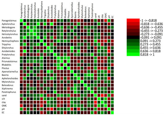 The result showed that the number of Ditylenchus sp. (r = 0.617) positively correlated with the soil’s clay. OMC negatively correlated with the number of Panagrolaimus sp. (r = −0.770), In addition, the pH of the soil had a negative correlation with the number of Acrobeloides sp. (r = −0.877) and Aporcelaimellus sp. (r = −0.771) (Figure 2).