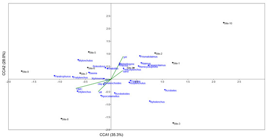 The Shannon Index (H’) [22] was calculated to assess nematode biodiversity. A Pearson correlation method in XLSTAT v.2021 [23] was used to compute a correlation between the soil physicochemical properties and the nematode community. Additionally, a canonical correspondence analysis (CCA) was conducted, based on the method by Zhang et al. [24], to evaluate the relationship between soil factors such as pH, EC, soil texture, OMC, and nematode.