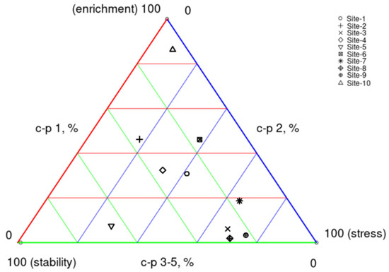 The c-p status of free-living nematodes can be a useful indicator of soil health in oak trees in Magoebaskloof, located in the Limpopo Province. Most soil samples taken from Magoebaskloof were close to enrichment conditions, as c-p 1–5 (which are nematodes) tended to increase by 80% in Site-5 (Figure 4). In contrast, basal nematodes (c-p 2) increased, while soil enrichment decreased by 100% in Site-10. None of the soils from Magoebaskloof showed 100% stress condition. Oak soils (Sites-1, 2, 4, 6) were enriched and stabled. Sites 7–9 were close to stress conditions due to plant-parasitic nematodes found in those soils (Figure 4).