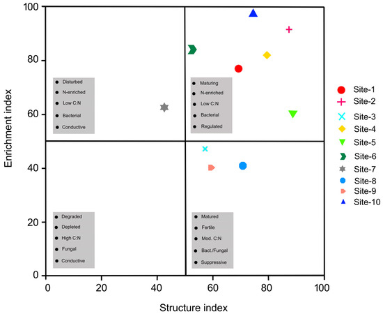 The channel index (CI) indicates the decomposition rate of soil organic matter [39]. The results showed that at Sites-3, 8, and 9, the CI was higher than 50, which indicates that bacterivores were more dominant, leading to a more rapid decomposition of organic materials. On the other hand, the CI was lower than 50 at the rest of the sites, suggesting that fungivore nematodes were dominant, and a lower rate of organic matter decomposition was expected.