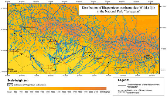 From the analysis of literary sources, it can be said that the study of R. carthamoides was carried out to study the ecological and biological characteristics of the species and assess the reserves of medicinal plants, mainly in the territory of the Altai ridges [42,43,44,45,46,47,48,49,50,51]. However, to date, the study of R. carthamoides in the territory of the Tarbagatai National Nature Park has not been sufficiently studied. In the works of E.F. Stepanova, N.A. Saparbaeva et al., F.M. Atalykova, and M.K. Kukenov only mention the presence of the species in the Tarbagatai ridge [52,53,54,55,56,57,58,59,60]. Based on this, developing a sustainable use regime is necessary to manage plant resources effectively and ensure their preservation.