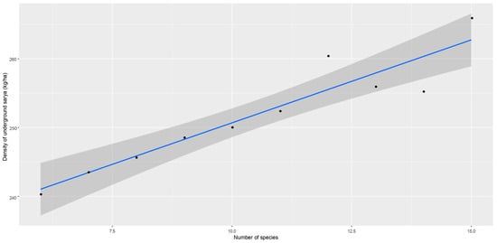 The scatter plot with the regression line shows that the density of underground raw materials also increases with an increase in the number of species. The confidence interval indicates a high reliability of this dependence.
