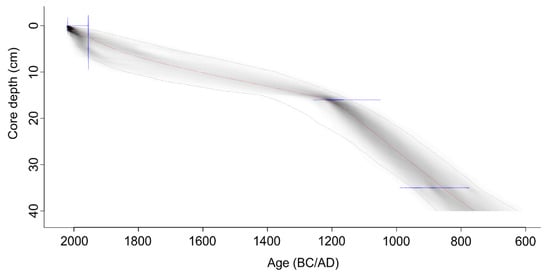 - Blaauw, M.; Christen, J.A.; Aquino Lopez, M.A.; Vazquez, J.E.; Gonzalez, O.M.V.; Belding, T.; Theiler, J.; Gough, B.; Karney, C. Rbacon: Age-Depth Modelling Using Bayesian Statistics. R Package Version 3.2.0. Available online: https://cran.r-project.org/package=rbacon (accessed on 4 November 2024).