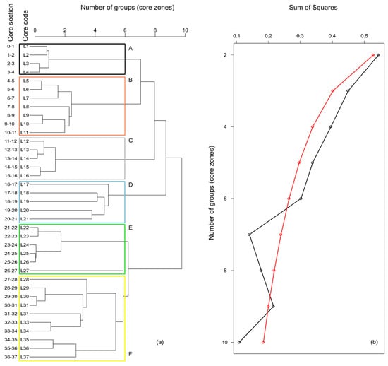 - Grimm, E.C. CONISS: A FORTRAN 77 program for stratigraphically constrained cluster analysis by the method of incremental sum of squares. Comput. Geosci. 1987, 13, 13–35. [Google Scholar] [CrossRef]