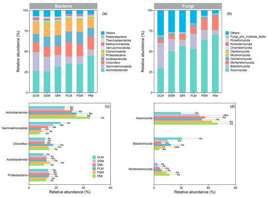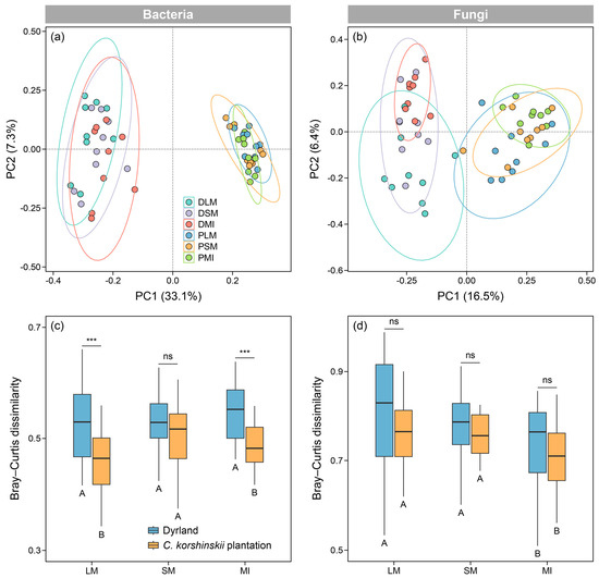 - Wang, M.; Masoudi, A.; Wang, C.; Yang, J.; Zhai, Y.; Wu, C.; Yu, Z.; Liu, J. Plantation type and afforestation age disclose variable influences on soil microbial compositions in man-made forests in the Xiong’an New Area, China. Land Degrad. Dev. 2022, 33, 3058–3073. [Google Scholar] [CrossRef]