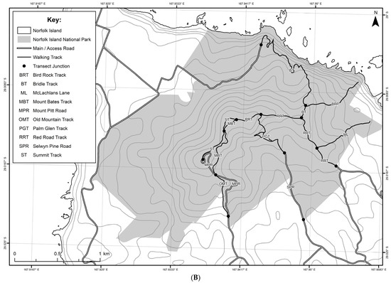 Maps of the Mount Pitt section of the Norfolk Island National Park where we conducted counts of the Tasman parakeet (Cyanoramphus cookii). (A) shows the distribution of survey points, and (B) shows the distribution of walking tracks and roads. Dark grey lines show the increase in elevation at 20 m intervals.