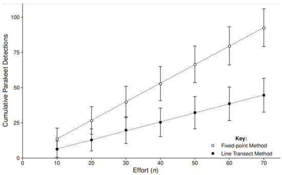 Fixed-point counts were also more precise than line transect counts. To achieve a similar level of precision to these fixed-point counts, a far larger sampling effort was required for line transect counts (Figure 2). Other studies suggest that fixed-point counts can result in biased estimates [32,33,34]. However, compared to line transect counts, accurately recording multiple detections is considered more straightforward for observers conducting fixed-point counts [29]. Furthermore, differences in the walking speed of observers may contribute to detection bias between sampling events, particularly when attempting to detect cryptically coloured species such as the Tasman parakeet.