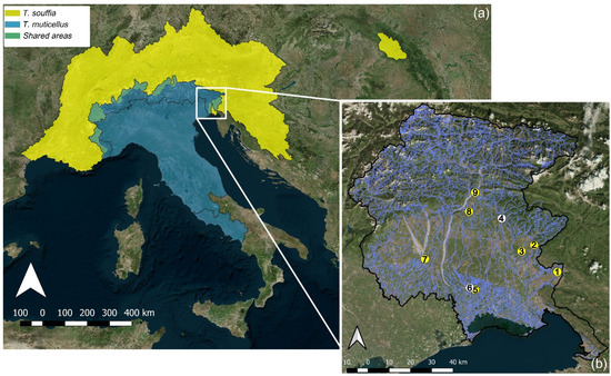 Distribution areas of T. souffia (yellow), T. muticellus (blue), and shared zones (green) (a); study area in the Friuli Venezia Giulia region and sampling sites analyzed for the presence of Telestes sp. In the present study (b), 1 = Isonzo River; 2 = Chiarò Creek; 3 = Natisone River; 4 = Cividina Ditch; 5 = Miliana Ditch; 6 = Cerclizza Ditch; 7 = Brentella Ditch; 8 = Ledra River; 9 = Tagliamento River. The yellow dots represent sites whose samples were used for genetic investigations.