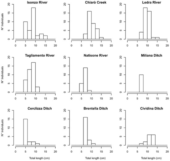 Total length frequency distributions observed for Telestes sp. specimens in watercourses where sampling operations were performed.