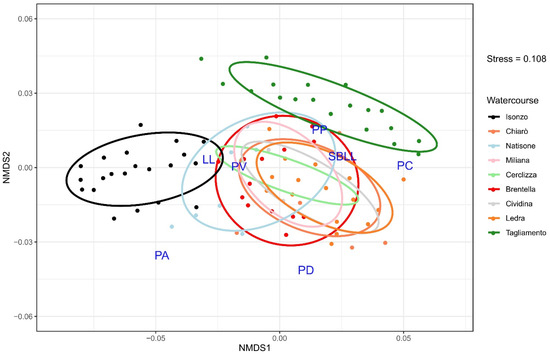 Populations observed in the Isonzo River, Chiarò Creek, Natisone River, Tagliamento River, and Ledra River were abundant and well structured, allowing for the sampling repetition in autumn. Autumnal fish samplings were not performed in the lowland ditches (Brentella, Cerclizza, and Miliana) nor in the Cividina Ditch to avoid additional stress for the populations. A summary of biometric and meristic characterization is reported in Table S1. The application of the non-parametric Kruskal–Wallis test allowed us to detect differences for all the analyzed variables (Kruskal–Wallis test: H > 30.9, d.f. = 8, p < 0.001), except for the number of scales above the lateral line (SALL) and the number of rays on caudal fin (PC) (Kruskal–Wallis test: H < 11.0, d.f. = 8, p > 0.2). Therefore, those meristic characters were excluded from the analyses described below. Values of the meristic characters observed in the collected specimens were compared with those reported in the literature for T. souffia and T. muticellus. On the basis of this analysis, it was possible to identify all the specimens collected in the Isonzo River as T. souffia, while those belonging to the other populations were all identified as T. muticellus (Table S1). The results of the Non-metric Multidimensional Scaling (NMDS) are reported in Figure 3. The NMDS converged on a two-dimensional solution with an acceptable stress level (non-metric fit r2 = 0.99; linear fit r2 = 0.96; stress = 0.108) [41]. Groups represented by specimens collected in the Tagliamento River and in the Isonzo River take place on the opposite sides of the graph, while other groups (=watercourses) overlap in the central section of the plot. The application of the ANOSIM allowed us to highlight that the differences among groups are significant (ANOSIM Rstatistic: 0.615, p < 0.001). The results of the SIMPER test are reported in Table 4.