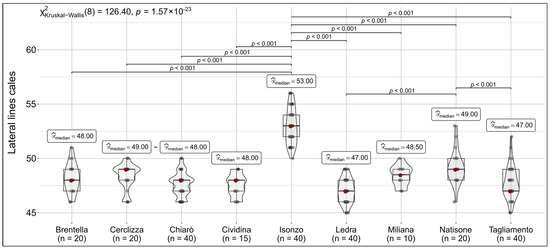 Box-plot for the number of lateral line scales recorded at each sampling site for Telestes sp. specimens analyzed in the present study. Results of the comparisons performed via the Kruskal–Wallis non-parametric test and Conover-Iman test are reported.