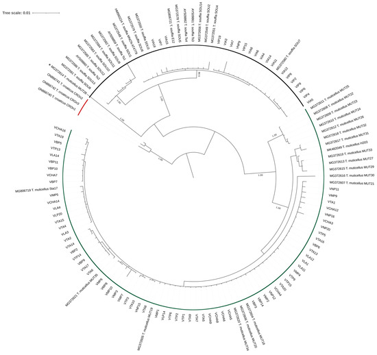 cyt b rooted Bayesian tree. In red, the cluster of T. croaticus is used as an outgroup. In green, the cluster indicates the sequences of T. muticellus, and in black, the cluster of T. souffia. With an asterisk, a single sequence reported as T. muticellus is shown, with clustering in T. souffia. Bootstrap support is shown for each branch. GenBank IDs for all the sequences are provided in Table S2.