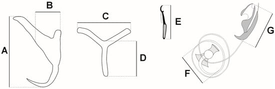 Scheme of measurements of the sclerotized structures of the haptor and copulatory complex of Urocleidoides spp. Anchors: (A) total length, (B) base width; dorsal bar: (C) total length, (D) width; hook: (E) total length; MCO: (F) diameter of the ring; accessory piece: (G) total length.
