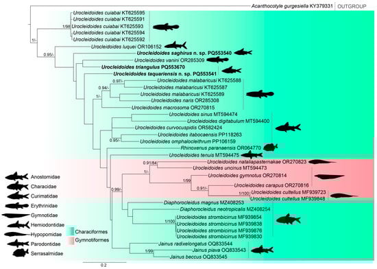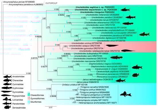 The lineage from gymnotiform hosts appeared to be separated, including species from Gymnotidae and Hipopomidae, with strong support. A second lineage composed of parasites from erythrinids appeared to be separated from U. atilaiamarinoi and U. vanini. This second lineage is well supported and includes the species U. bulbophalus Ferreira, Rodrigues, Cunha & Domingues, 2017; U. naris Rosim, Mendoza-Franco & Luque, 2011; U. brasiliensis Rosim, Mendoza-Franco & Luque, 2011; and U. macrosoma Santos-Neto & Domingues, 2023. This lineage appeared to be related to the clade encompassing species of Diaphorocleidus, Cacatuocotyle, and Rhinoxenus. The new species U. saghirus n. sp. appeared as the earliest divergent taxon, with strong support, in relation to the other species from curimatids and parodontids. Meanwhile, U. taquariensis n. sp. appeared as a sister taxon to U. triangulus, with strong support.
