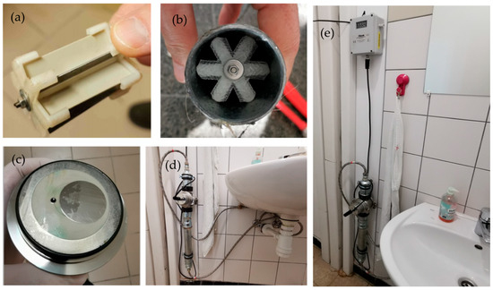 Devices were installed in a healthcare facility (N) and a long-term care residential home (S) in the north and south of Budapest, respectively. Two locations were selected in both facilities, one near to and one far from the point of entry of drinking water. In facility N, it was on the first and the sixth floor (N1 and N2), while in facility S, in the basement (S1) and on the ground floor (S2). Devices were installed by 1/2” nominal diameter flexible pipes using the appropriate diffuser and confuser fittings in the incoming line of toilet water tanks, or before hand-washing sinks where water is not consumed (Figure 1d,e). This way, regular water use, and therefore flow within the device, was ensured without posing a risk to the consumers.