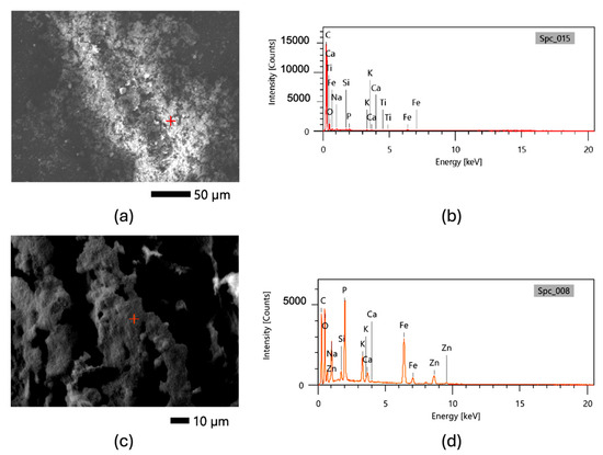 Scanning electron microscopic (SEM) images and results of SEM-EDX analysis of surfaces. (a) S1P-1 SEM image, (b) S1P-1 EDS chromatogram, (c) S2P-6 SEM image, (d) S2P-6 EDS chromatogram.
