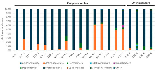 Proteobacteria were the overwhelmingly dominant phylum in month 1 samples on all coupons (86.4–99.9%), with Actinobacteria appearing in three of the eight samples (1.2–13.3%) (Figure 3). In month 3, the relative abundance of Proteobacteria decreased, ranging from 36.8 to 84.2%, while the relative abundance of Actinobacteria increased, reaching 6.2–62.2% in the samples, with the highest relative abundance in location N2. Bacteroidota was detected in three of the four N samples (4.5–11.7%). By month 6, the relative abundance of Proteobacteria further decreased and that of Actinobacteria further increased. In the N2P sample, Verrucomicrobiota and Cyanobacteria were also present (1.4 and 5.7%, respectively). Communities on the sensors (collected in month 6) were also dominated by Proteobacteria (78.2–94.4%), accompanied by Actinobacteria in the S1O and Bacteroidota in the N1O samples (4.5 and 9.8%, respectively). In the S2O sample, five phyla were present in a relative abundance of 2–5%, in addition to Proteobacteria (Acidobacteriota, Bacteroidota, Bdellovibrionota, Cyanobacteria, Dependentiae, Verrucomicrobiota), while in N2M-6, Actinobacteria, Bacteroidota, Spirochaetota and Verrucomicrobiota were detected in a relative abundance of 1.1–3.9%.