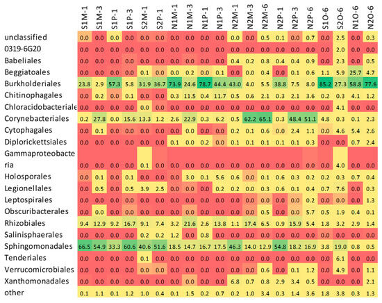 By order level, Burkholderiales and Sphingomonadales were most abundant in month 1 in all sampling locations, together comprising over 90% relative abundance in most samples (Figure 4). Rhizobiales were also present in all month 1 samples, although in N1 and N2 samples were found in much lower abundance than in S1 and S2 (1–3.2% and 7.4–9.4%, respectively). Other orders only reached 1% abundance in a subset of samples: Corynebacterales and Legionellales in S2 samples, Salinibacterales in N1M, and Xanthomonadales in both N2 samples. In month 3, the abundance of Corynebacteriales and Rhizobiales increased (reaching up to 62.2% and 21.6%, respectively) and Burkholderiales decreased considerably (by 20–30%) in most samples. Chitinophagales and Holosporales occurred in N1 samples (11.5% and 4.3% on average), and Chitinophagales, Cytophagales, Verrucomicrobiales and Xanthomonadales were present in N2 samples in low abundance (<2.5%). Month 6 samples (available only for N2) were similar to month 3 with a further decrease in Rhizobiales and Sphingomonadales, and the emergence of Obscuribacterales and Verrucomicrobiales.