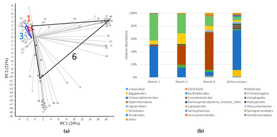 (a) Principal component analysis of the microbial community structure of biofilm samples collected after 1, 3 or 6 months. Polygons enclose samples belonging to the same sampling time. Numbers indicate OTUs; for a full list, see Table S3. (b) Visualization of the relative abundance of sequences at order level. Orders <1% abundance are indicated as “other”.
