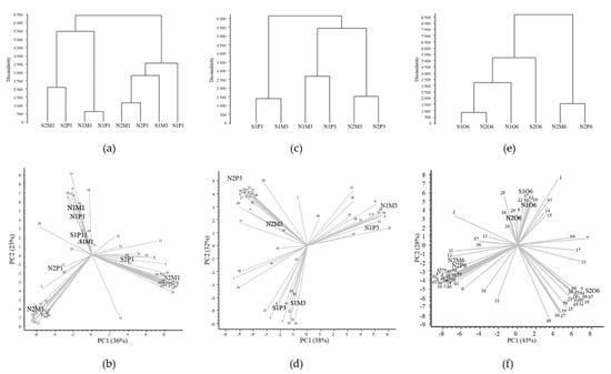 Dendrograms and principal component analysis of the microbial community structure of biofilm samples collected after (a,b) 1 month, (c,d) 3 months or (e,f) 6 months. Numbers indicate total OTUs; for a full list, see Table S3.