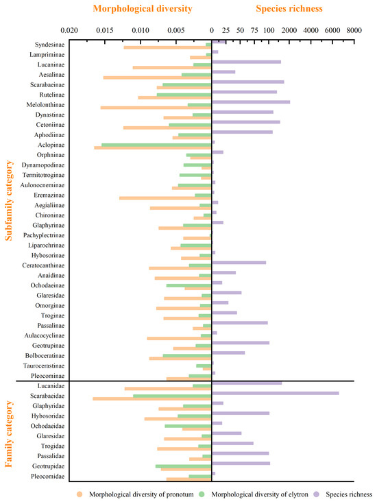Morphological diversity of both the pronotum and elytron among the 10 families and 34 subfamilies reflects the influence of phylogenetic factors. The Scarabaeidae exhibited both the highest morphological diversity (Suppl. 2 and 3) and species richness (Figure 1), while the Passalidae was found to have the lowest relative morphological diversity (Figure 1).