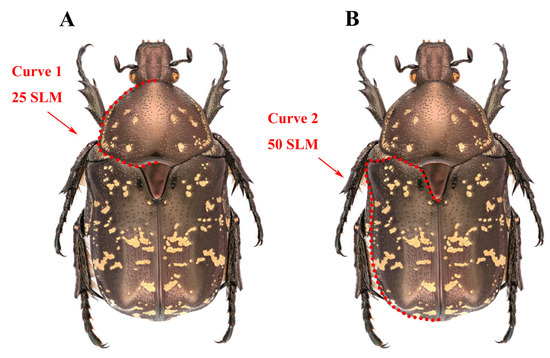 Semi-landmarks selection of test characters based on geometric morphometrics, Protaetia brevitarsis (Scarabaeoidea, Sacarabaeidae, and Cetoniinae) was selected as an example. (A) Pronotum (curve 1) was resampled in 25 semi-landmarks (SLM). (B) Elytron (curve 2) was resampled in 50 semi-landmarks (SLM).