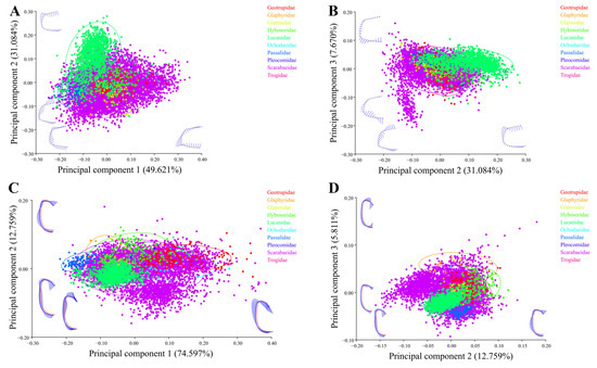 Principal component analysis on family level: the first three principal components of pronotum (88.374%) and elytron (93.167%) were selected to represent shape variation. (A) Variation in test pronotum in space built by PC1 and PC2. (B) Variation in test pronotum in space built by PC2 and PC3. (C) Variation in test elytron in space built by PC1 and PC2. (D) Variation in test elytron in space built by PC2 and PC3.