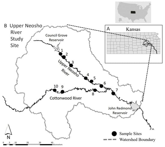 Map of the study area including (A) the Neosho River within the state of Kansas, and (B) ten 3 km sampling sites (1–10) within the Upper Neosho River watershed along the Neosho and Cottonwood Rivers, KS. The study areas were in Morris, Lyon, and Chase County, KS, USA.