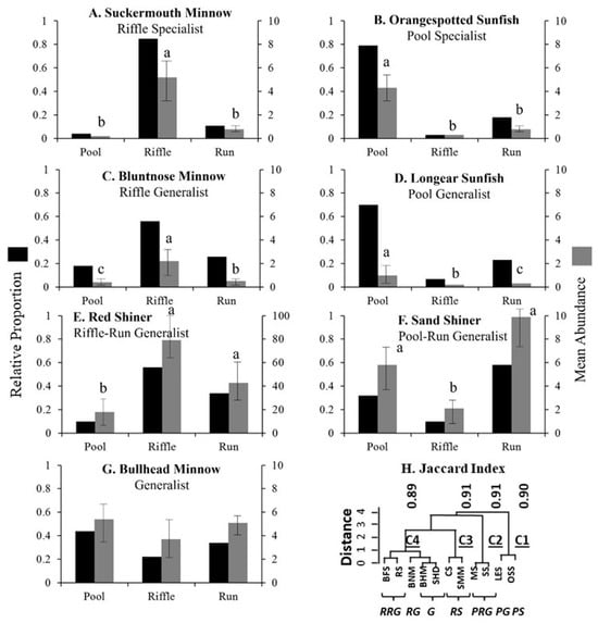Bar plots showing relative proportion (primary y-axis—black bar) and mean abundance (secondary y-axis—gray bar) within each mesohabitat (pool, riffle, and run). Functional habitat guilds are shown for each species. Data are mean ± SE. Fish examples include (A) Suckermouth Minnow (SMM), (B) Orangespotted Sunfish (OSS), (C) Bluntnose Minnow (BNM), (D) Longear Sunfish (LES), (E) Red Shiner (RS), (F) Sand Shiner (SS), and (G) Bullhead Minnow (BHM) [Note: plots for the Bluntface Shiner (BFS), Slenderhead Darter (SHD), Central Stoneroller (CS), and Mimic Shiner (MS) were not included in the figure). Additional details on the abundance, occurrence, and proportion of all species are provided in Table 1. Results from the cluster analysis (H) were used to validate the assignment of fish into functional habitat guilds [riffle–run generalist (RRG), riffle generalist (RG), generalist (G), riffle specialist (RS), pool–run generalist (PRG), pool generalist (PG), pool specialist (PS)].