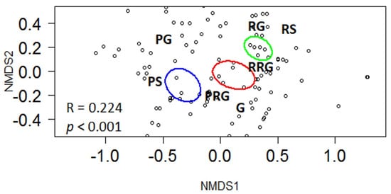 NMDS confirmed insights from the previous two analyses but emphasized differences in habitat type (Figure 3). The ANOSIM revealed a distinct separation (R = 0.224; p < 0.01) of pool-, riffle-, and run-related functional guilds. The riffle specialist (RS) and riffle generalist (RG) functional guilds were strongly associated with the riffle habitat (green ellipse; Figure 3). The pool specialist (PS) and pool generalist (PG) functional guilds were strongly associated with the pool habitat (blue ellipse; Figure 3). The riffle–run generalist (RRG) and pool–run generalist (PRG) functional guilds were found between riffle–run and pool–run habitats, respectively (red ellipse; Figure 3). The generalist functional guild was not strongly associated with any mesohabitat (Figure 3).