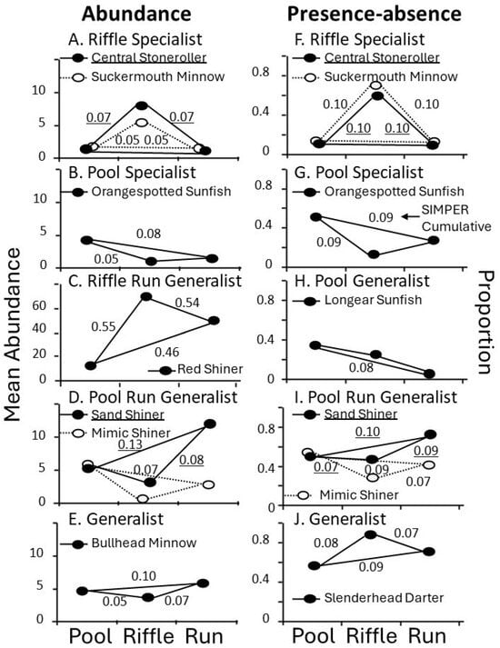 Plot of SIMPER results for influential fish species from fish–mesohabitat guilds based on (A–E) mean abundance (y-axis) for the abundance dataset and (F–J) proportion (y-axis) for the presence/absence dataset. Data are means. Guilds include (A,F) riffle specialist, (B,G) pool specialist, (C) riffle–run generalist, (D,I) pool–run generalist, (E,J) generalist, and (H) pool generalist. Numbers indicate the cumulative sum explained by the SIMPER analysis per fish species between each set of habitats.