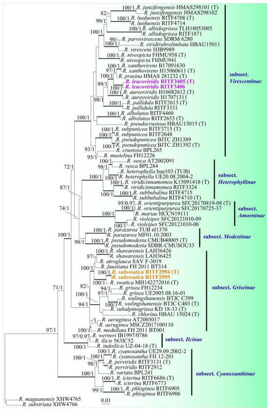 Russula leucoviridis is phylogenetically positioned as the sister taxon to a clade consisting of two Chinese species, R. prasina G.J. Li & R.L. Zhao and R. xanthovirens Y. Song & L.H. Qiu, with 100% bootstrap support and 1.00 posterior probabilities. Our second species, R. subswatica, clustered with the Pakistani species R. swatica Sarwar & Hanif, demonstrating robust phylogenetic support with 100% bootstrap support and 1.00 posterior probabilities.