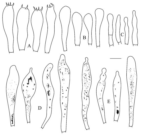 Microscopic structures of Russula leucoviridis. (A) Basidia. (B) Basidiola. (C) Marginal cells. (D) Hymenial gloeocystidia on lamellae sides. (E) Hymenial gloeocystidia on lamellae edges. Scale bar: 10 μm.