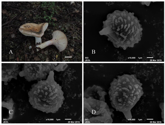 Basidiomata and microscopic structures of Russula subswatica. (A) Basidiomata. (B–D) Basidiospores in SEM (JSM-6510LV). Scale bars: 15 mm (A), 1 μm (B–D).